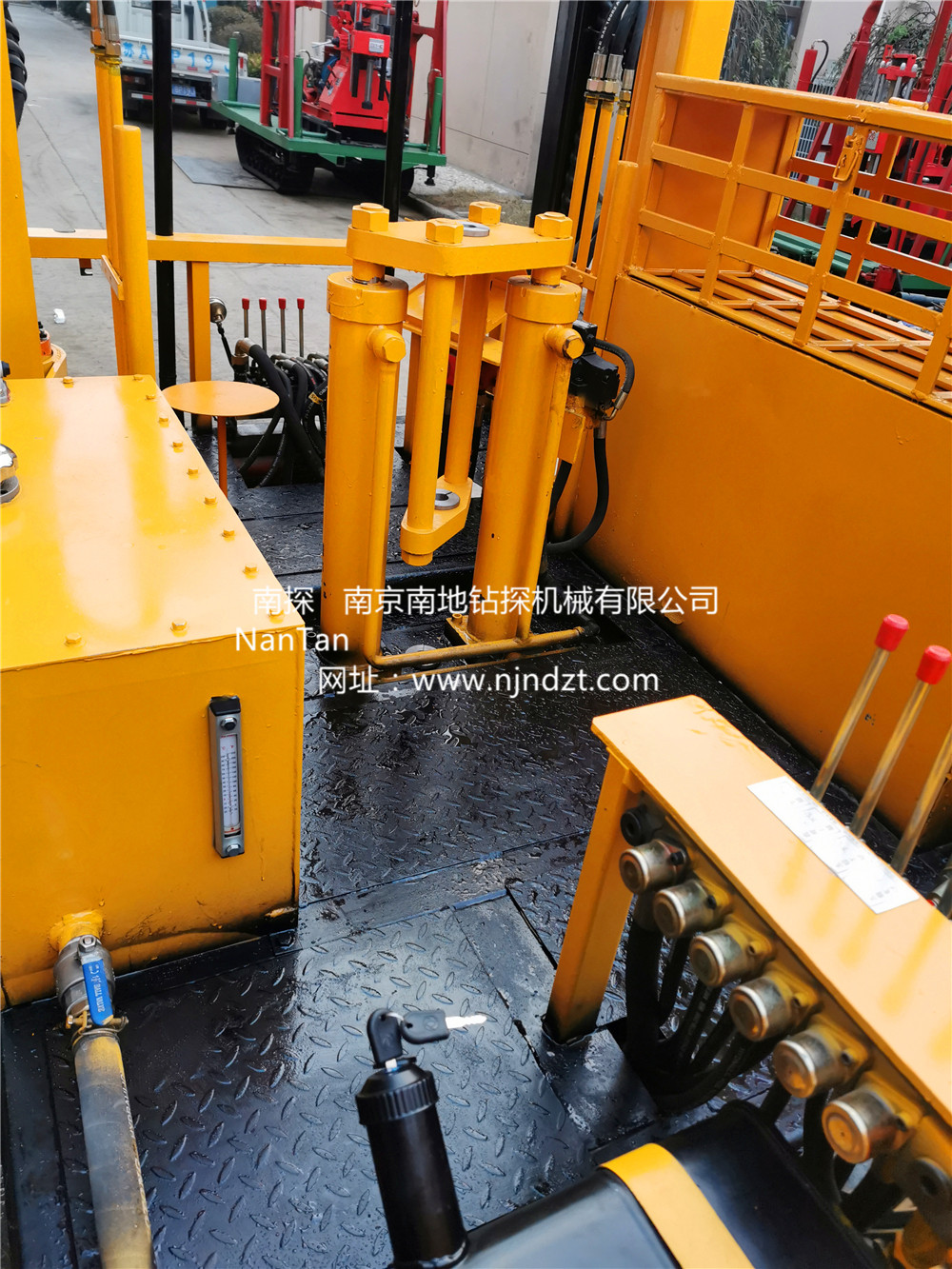 NTLPSY-L8-20T-SG型履帶靜力觸探車由自行走履帶底盤、1臺(tái)四缸柴油機(jī)、20T液壓靜探機(jī)、自動(dòng)伸縮式升高型上下車液壓支撐腿系統(tǒng)、2組液壓下錨機(jī)、控制器、平臺(tái)及駕駛機(jī)構(gòu)等組成,共同組裝在一個(gè)機(jī)架上。